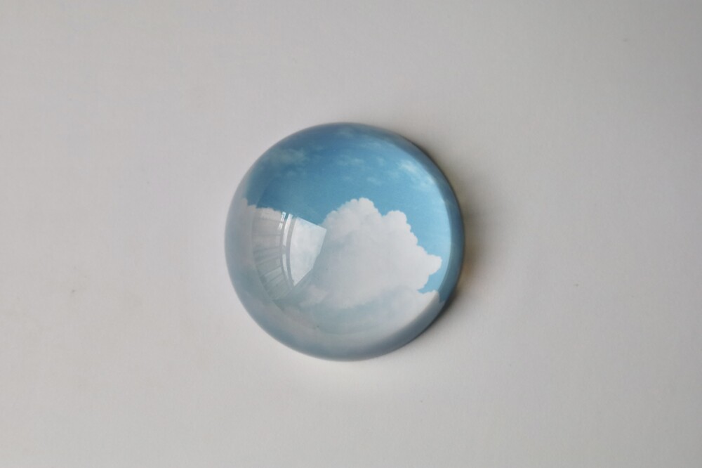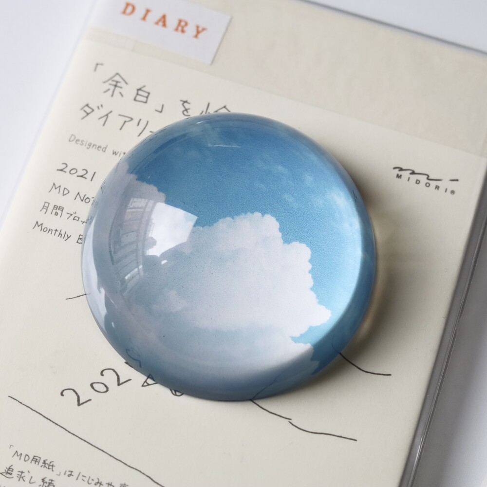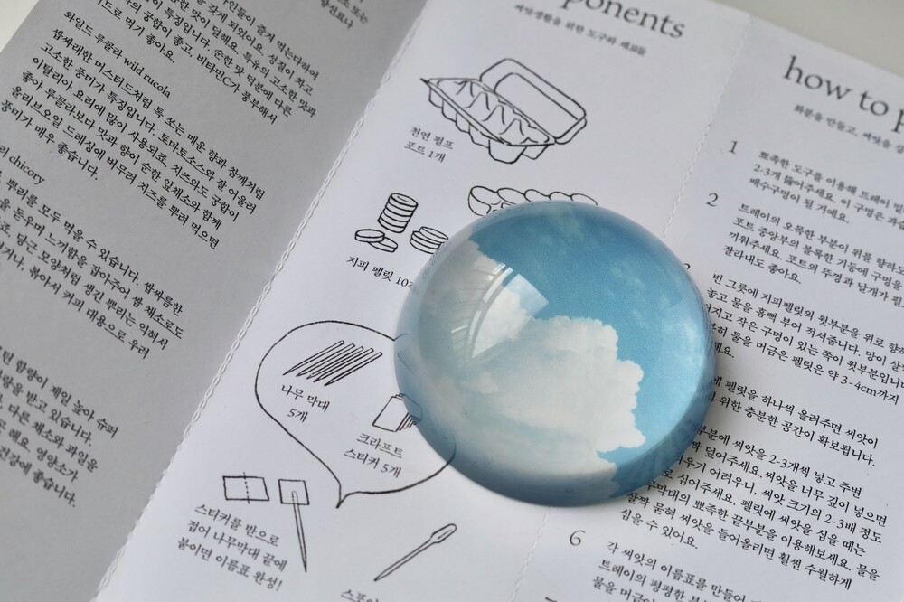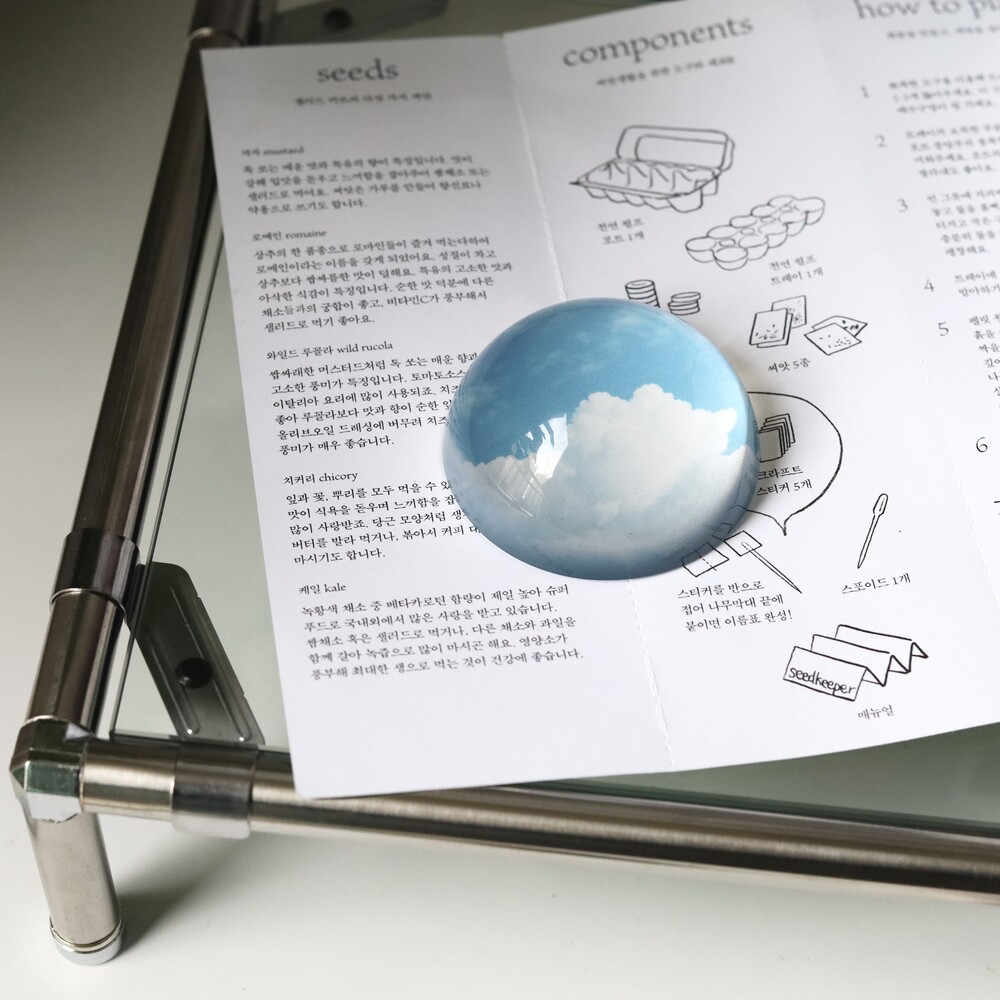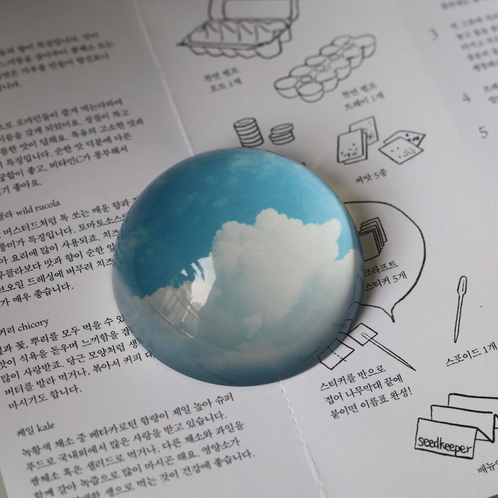 - 문진은 유리반구 아래 이미지가 인쇄된 하얀색 스티커가 접착되어 있는 형태입니다.