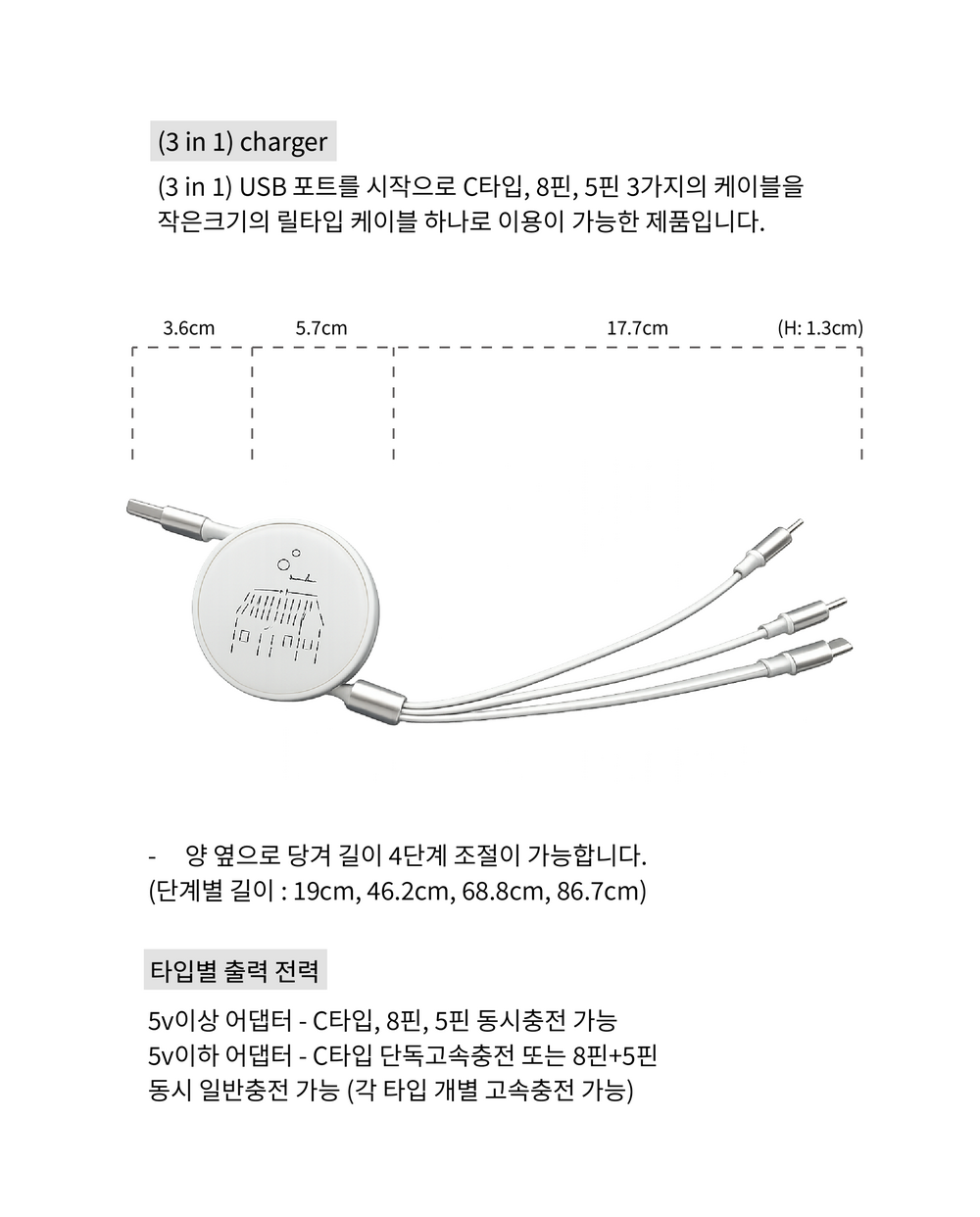 - C타입, 8핀, 5핀 3 in 1 멀티 릴 타입의 고속 충전 케이블 입니다.