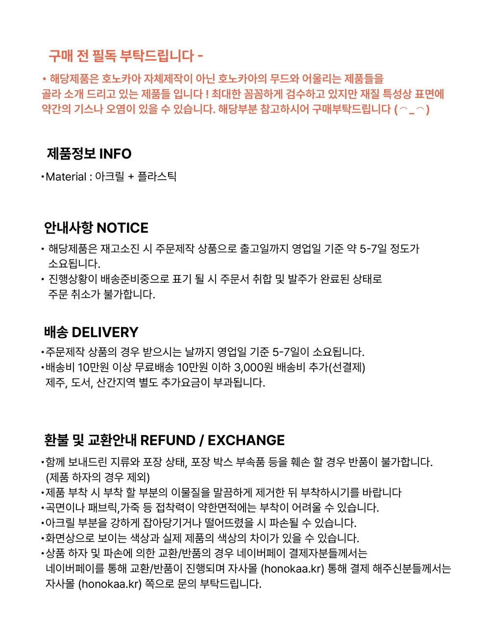 -상품 하자 및 파손에 의한 교환/반품의 경우 받으신 배송일자로부터 7일이내 네이버페이 결제자분들께서는 네이버페이를 통해 교환/반품이 진행되며 무통장입금,카드결제 등 사이트를 통해 결제해주신분들께서는 사이트 게시판, 또는 카카오톡 문의하기를 통해 연락주시면 빠른 처리 도와드리겠습니다.]